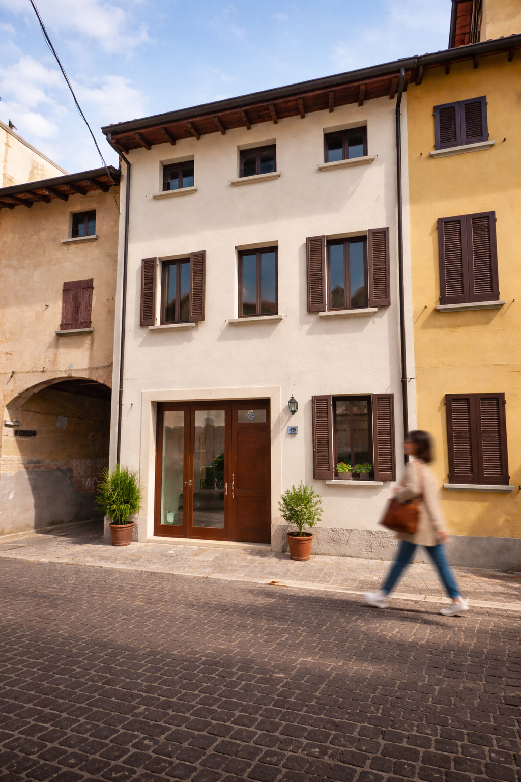L’intervento è in nucleo storico di antica formazione, dai caratteri rurali: il nuovo prospetto restituisce ordine e pulizia, senza alterare il ritmo della facciata.